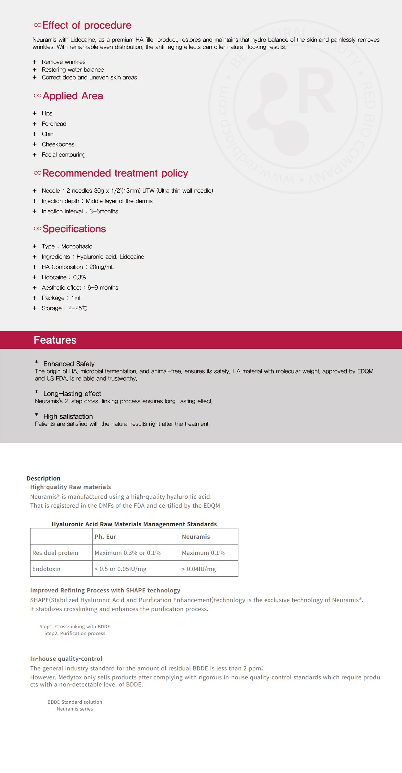 Neuramis with Lidocaine, as a premium HA filler product, restores and maintains that hydro balance of the skin and painlessly removes wrinkles. With remarkable even distribution, the anti-aging effects can offer natural-looking results. / Remove wrinkles. / Correct deep and uneven skin areas.